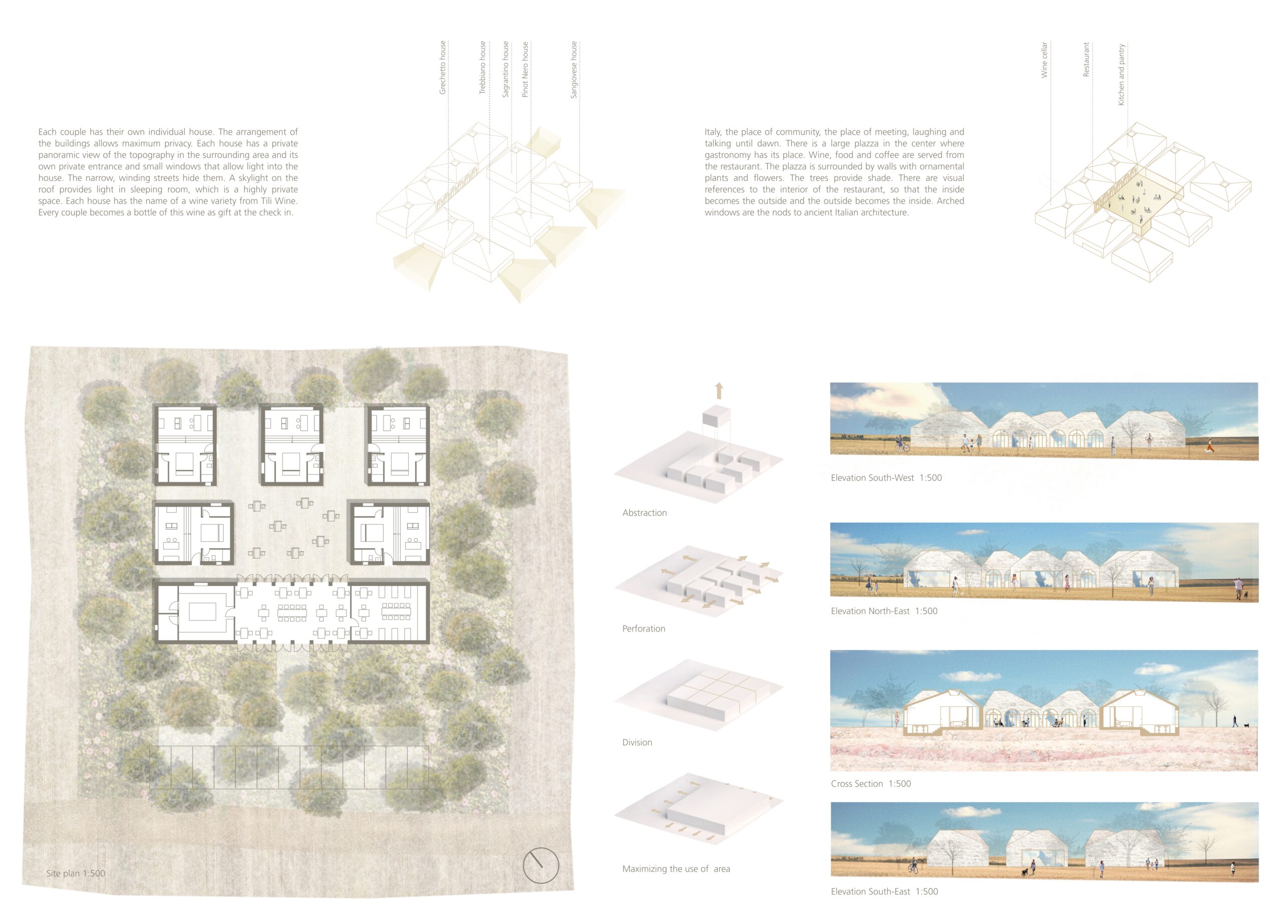 Der Wettbewerb „Tili Wine Italy Guest Homes“ wurde in Zusammenarbeit mit Tili Vini Italy, einem Weingut in der mittelitalienischen Region Perugia, durchgeführt. Die Wettbewerbsteilnehmer wurden gebeten, fünf Gästehäuser auf dem Weingutsgelände zu entwerfen, die jeweils Platz für ein Paar bieten. Tili Vini produziert eine Reihe hochwertiger Bioweine mit nachhaltigen Methoden, ohne Einsatz von Chemikalien und mit Fokus auf neue Technologien zur CO2-Reduktion. Gesucht wurden umweltfreundliche, zukunftsweisende Ideen für den einzigartigen Standort.