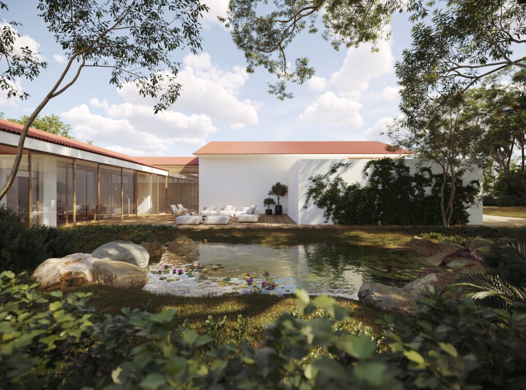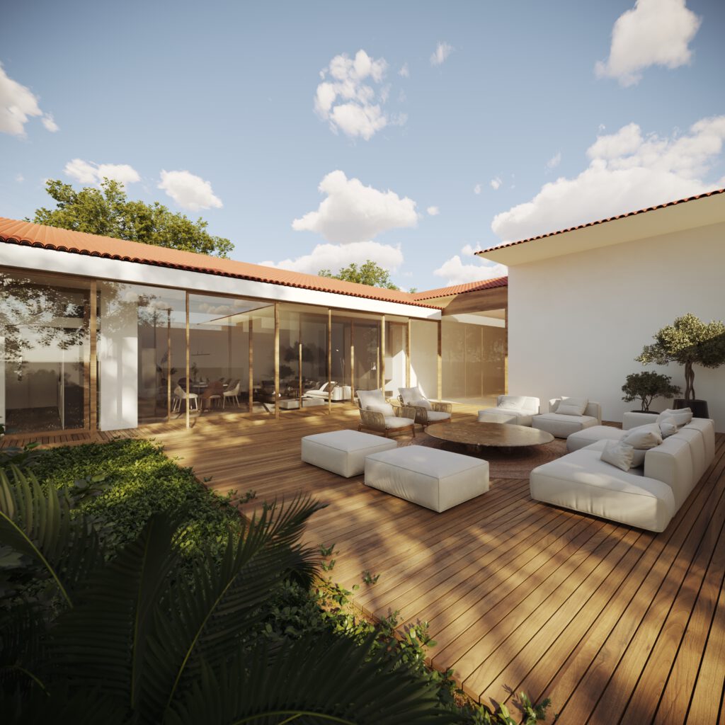 Eine gemeinschaftliche Terrasse im Mittelpunkt lädt zum Verweilen und zum geselligen Miteinander ein.