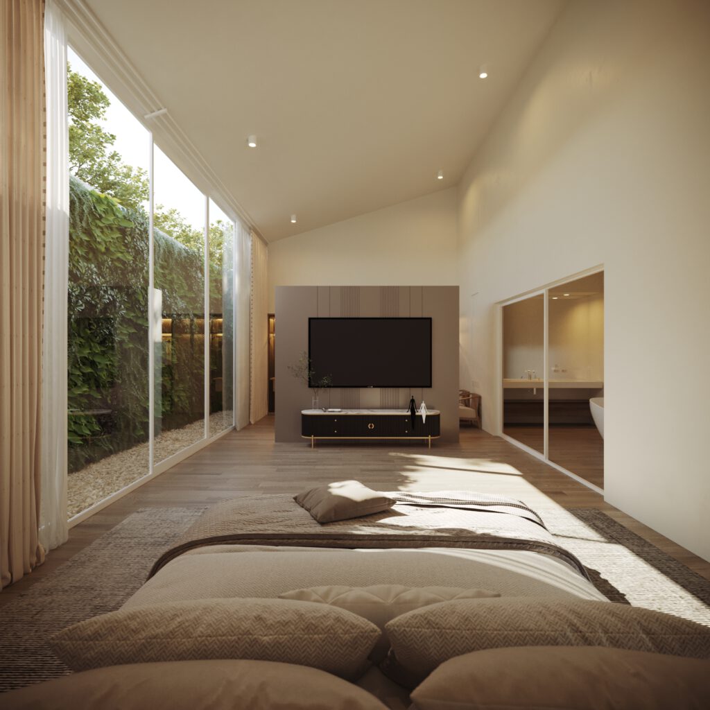 Das gesamte Areal wird durch eine Schallschutzmauer wirkungsvoll von der stark befahrenen Straße abgeschirmt. Diese introvertierte Haltung setzt sich konsequent im gesamten Entwurf fort. Ein Anbau mit Schlafraum und Bad orientiert sich zu einem kleinen, privaten Garten, der einen ruhigen Außenbereich bildet.