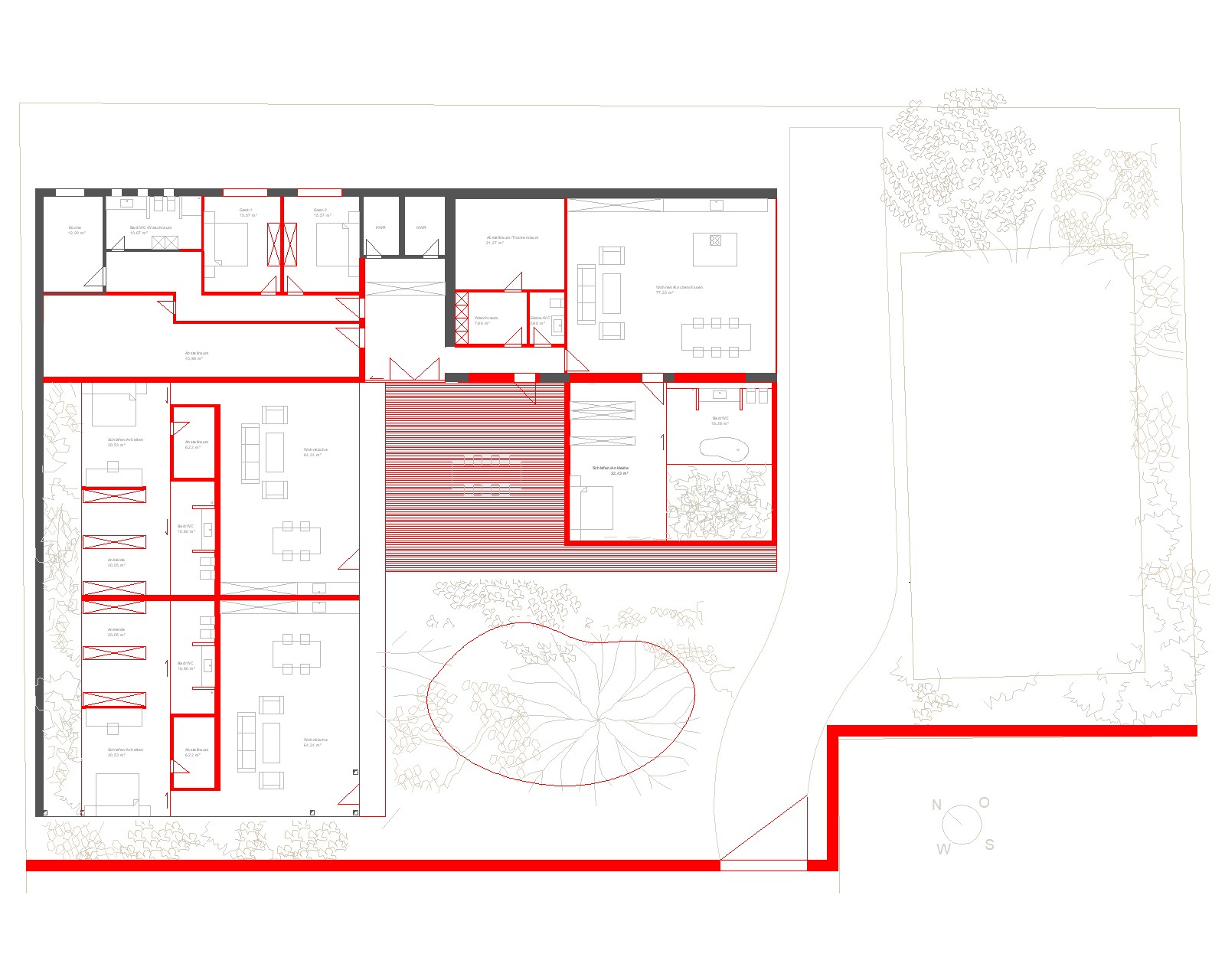 Ein Bestandsgebäude mit einer Fläche von bis zu 600 m² sollte von einer gewerblichen Nutzung in ein Wohngebäude umgewandelt und entsprechend neu konzipiert werden. Die Herausforderung bei der Grundrissgestaltung lag diesmal nicht in einer zu geringen Wohnfläche – im Gegenteil: Mit einer Gebäude­breite von nahezu 15 Metern war das Hauptgebäude für Wohnzwecke eher überdimensioniert.